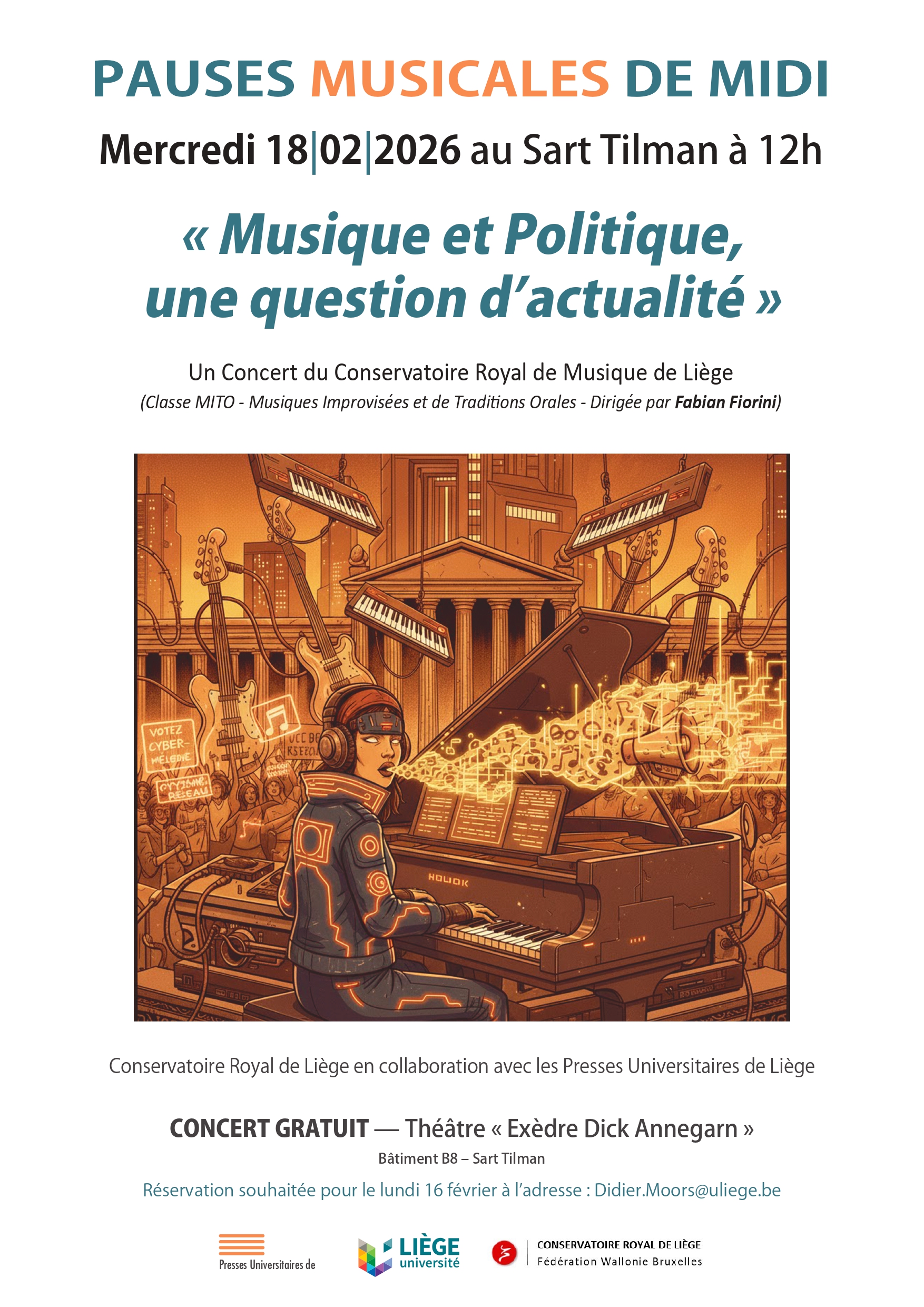 Horaires : Masterclass de Marco Momi le jeudi 26 février de 14h00 à 18h00 au D14(Pousseur) – Présentation de sa musique vendredi 27/2 de 10h00 à 12h00 A205