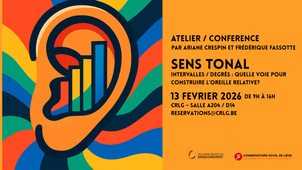 Le Conservatoire présente une conférence-atelier intitulée « Intervalles / degrés : quelle voie pour construire l’oreille relative ? », fruit d’une recherche spécialisée en formation musicale. Cette session sera suivie de deux ateliers pratiques animés par l’auteure et Frédérique Fassotte (Académie Grétry) pour explorer le sens tonal de manière ludique et imagée.